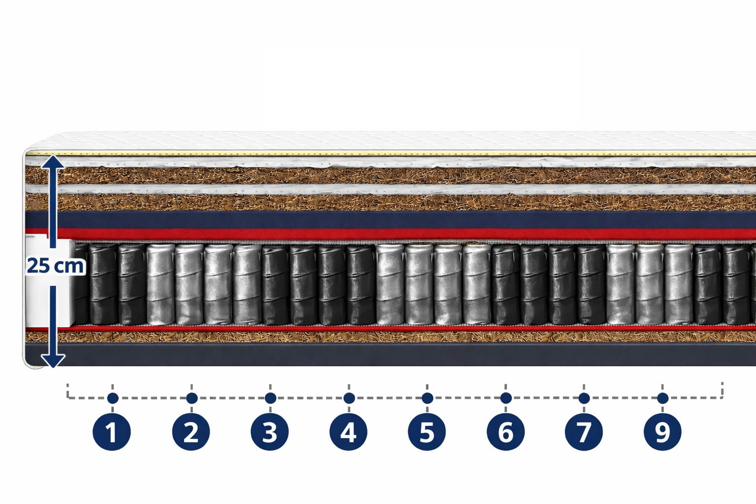 Zastosowany 18-centymetrowy system sprężyn kieszeniowych dzieli materac na 9 stref twardości, zapewniając właściwe podparcie dla każdej części ciała – od głowy aż po nogi. Każda sprężyna pracuje niezależnie, umieszczona w osobnej, elastycznej otulinie, co pozwala materacowi precyzyjnie dopasować się do sylwetki.