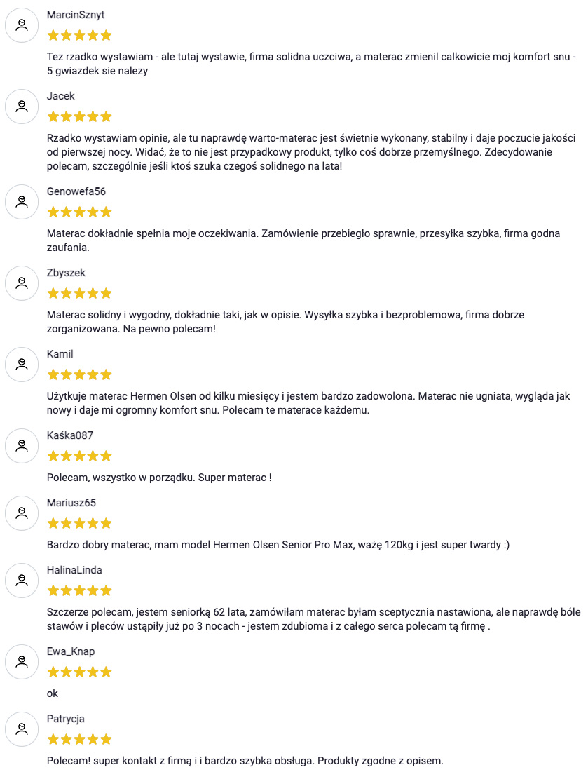 Dziękujemy naszym Klientom za zaufanie oraz za dzielenie się swoimi doświadczeniami. To właśnie ich opinie są dla przyszłych kupujących najlepszym potwierdzeniem jakości i skuteczności naszych materacy.