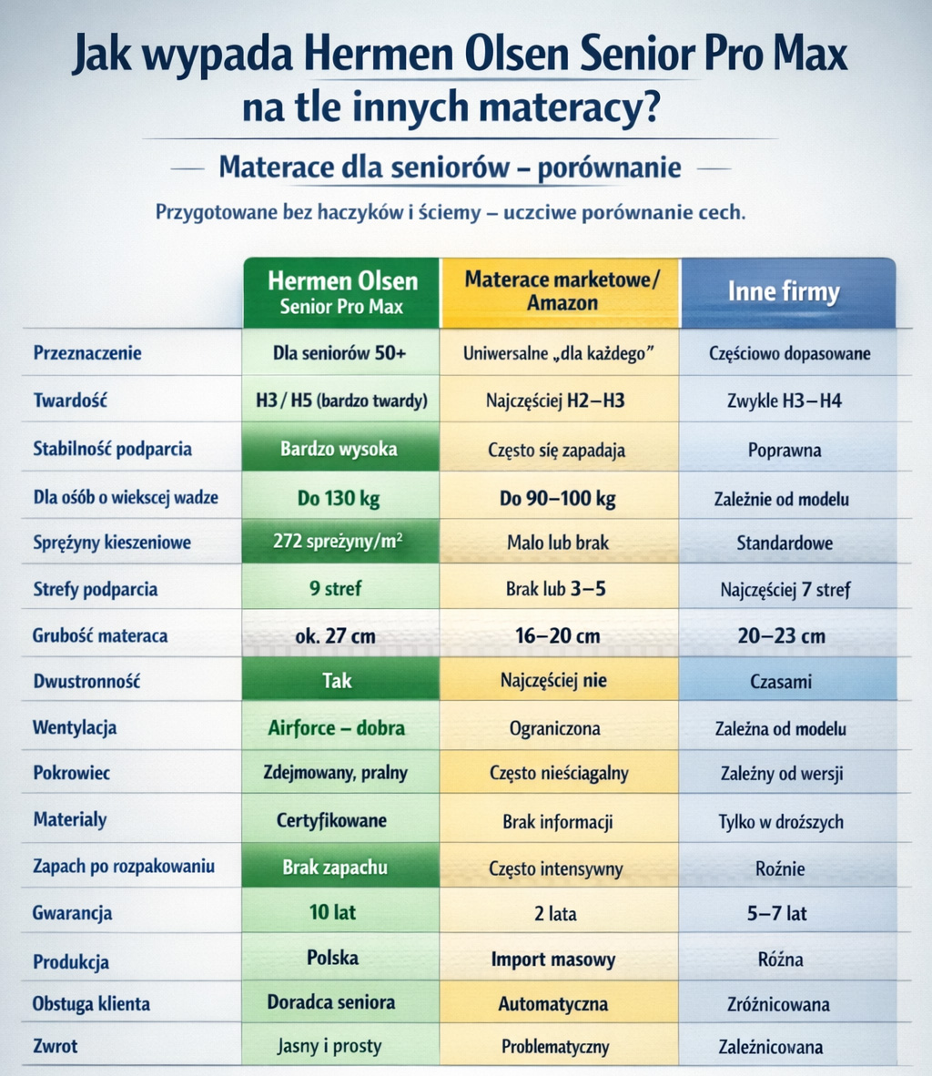 Tak. Hermen Olsen Senior Pro Max został zaprojektowany specjalnie z myślą o osobach po 50. roku życia, które potrzebują bardzo stabilnego, przewidywalnego podparcia oraz łatwego wstawania z łóżka.