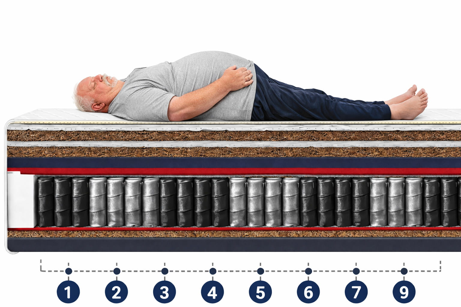 Zastosowany 18-centymetrowy system sprężyn kieszeniowych dzieli materac na 9 stref twardości, zapewniając właściwe podparcie dla każdej części ciała – od głowy aż po nogi. Każda sprężyna pracuje niezależnie, umieszczona w osobnej, elastycznej otulinie, co pozwala materacowi precyzyjnie dopasować się do sylwetki.